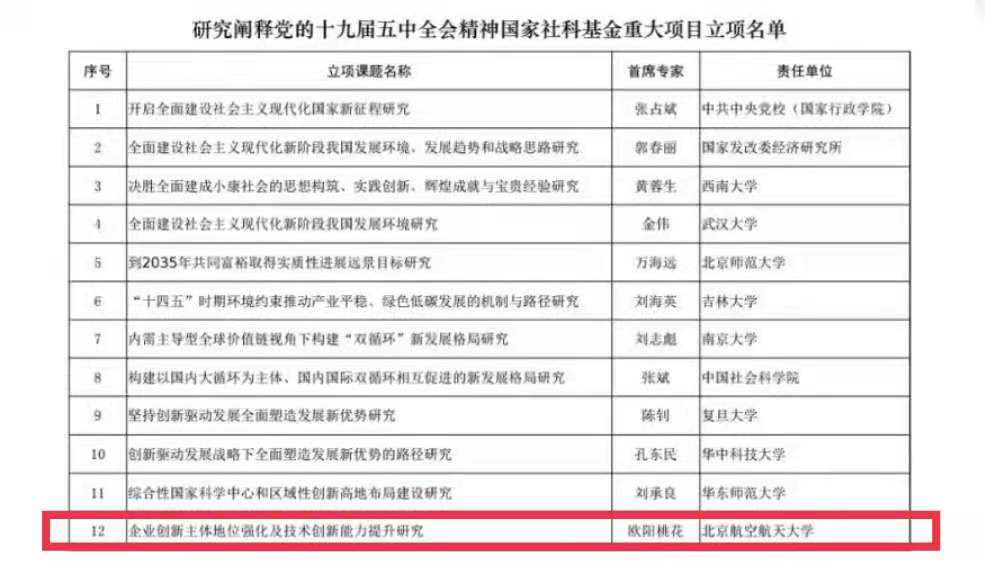 “研究阐释党的十九届五中全会精神”国家社科基金重大项目立项名单正式公布,北京亚洲成人在线一二三四五六区共有1项入选,即经管学院欧阳桃花教授团队的课题“企业创新主体地位强化及技术创新能力提升研究”。这是我校国家社科重大项目立项取得的又一次重要突破。