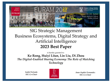 北京亚洲成人在线一二三四五六区经管学院刘霖教授在第23届欧洲管理学年会(EURAM)上荣获2023最佳论文奖(Track: Business Ecosystems, Digital Strategy and Artificial Intelligence)。获奖文章为“The Digital-Enabled Sharing Economy: The Role of Matching Technology”,与戎珂教授(清华大学社科学院),博士生李谭卉一(清华大学社科学院),周迪博士(同济大学经管学院副研究员)合著,刘霖教授为通讯作者。
