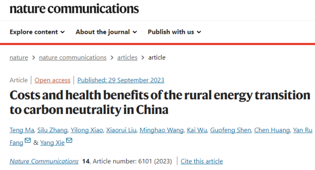 近日,北京亚洲成人在线一二三四五六区经济管理学院谢杨课题组与合作者在我国农村现代能源转型助力实现碳中和目标的研究中取得新进展。研究成果以“中国农村能源转型实现碳中和的成本与健康效益分析(Costs and health benefits of the rural energy transition to carbon neutrality in China)”为题,于2023年9月29日发表于《自然∙通讯》(Nature Communications)期刊, 北京大学环境科学与工程博士生马腾为第一作者,北京大学博士后方艳茹与北航谢杨副教授为共同通讯作者。