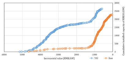 采用DSPV+RBESS的农村居民部门用户,可以节约94.4%~127.6%的年电费支出,大部分投资者可以通过向电网售电实现正向收益,随着光伏渗透率的提升,2030年前,电费节约规模将持续快速增加,随后增速逐渐放缓。在Base情景下,DSPV+RBESS倾向于优先部署在光伏资源条件较好的地区,且在生命周期内大多数RBESS的增量收益(相对于仅部署DSPV)较低,超过71.7%的RBESS项目增量价值低于1000元/kW;而在TOU情景下,RBESS的收入构成将更大程度上受到电力峰谷价差的影响,生命周期内RBESS的增量收益显著增加,近80%的RBESS项目可以实现超过1000元/kW的增量收益。