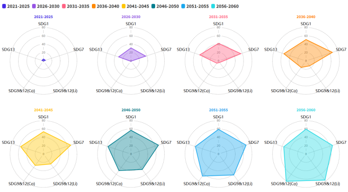 ● 长期(2041~2060年):在这一时期,退役电池规模将远超过农村居民部门DSPV+RBESS的需求,仅有约不到15%的退役电池可被用于DSPV+RBESS。退役电池回收利用体系对SDG9和SDG12的贡献较大,从退役电池中再生的Li资源可以达到0.2~9.5万吨/年,Co资源可以达到0.3~9.9万吨/年。