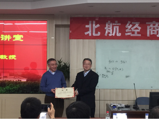 黄海军副校长在致辞中谈及,大力发展经济学与商学是北航建设国际一流大学的重要支撑之一。经济管理学院作为全国知名的研究型学院,经过六十年的发展,有非常好的研究基础。北航经济与商学研究院依托北航经管学院进行建设,并能成功邀请到李彤教授加盟,对推动北航经济学与商学的学科发展,促进国际合作,有非常重要的意义。希望未来,以经济与商学研究院作为平台,在李彤教授的带领下,在大家的共同努力下,将北航经济学与商学学科打造成国际一流学科。当天下午,李彤教授为北航经商大讲堂做了一场精彩的学术报告,报告主题是:Econometrics of Auctions。报告会由经济管理学院韩立岩教授主持。