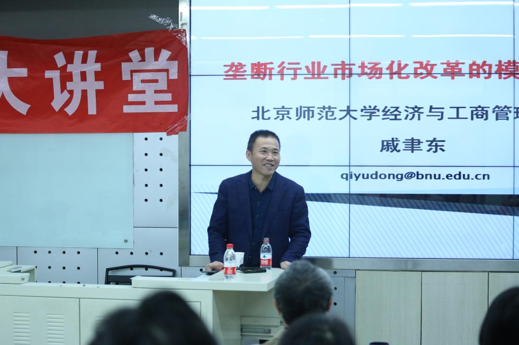 2018年1月16日,北航经商大讲堂邀请到戚聿东教授主讲第19期系列报告。戚聿东教授现任北京师范大学经管学院教授、博士生(后)导师,培养博士后、博士生和硕士研究生120余人。主持国家社科基金重大项目、重点项目等国家级项目4项,出版9部较有影响的学术著作,在《经济研究》、《管理世界》等著名期刊发表论文150余篇。兼任商务部WTO新一轮多边谈判专家咨询组成员,国家发改委价格政策专家中国企业联合会职业经理人资格认证指导委员会副主任,中国企业管理研究会常务副理事长,中国工业经济学会常务副理事长,北京市社会科学界联合会常委,中国企业财务管理协会北京专家委员会秘书长,首都企业改革与发展研究会常务副会长。咨询组成员,全国人大法工委和国务院法制办反垄断立法专家委员会成员。他的此次报告题目是垄断行业市场化改革的模式与路径。报告会于新主楼A618举行,由经济管理学院韩立岩教授主持。