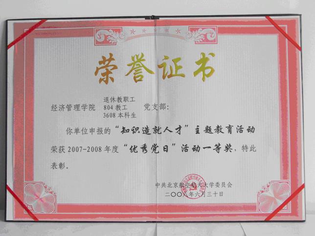 2008年“优秀党日”活动经校党委组织专家组评审,共评选出12个校级优秀党日活动,我院在本次活动评选中成绩骄人,推选的两项“优秀党日”活动分获校级一等奖和二等奖。