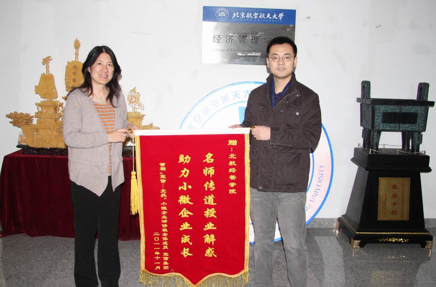 12月12日下午,宜信集团企业发展部高级经理姜川、孙丽娜代表该公司及小微企业学员来到我院MBA教育中心,将印有“名师传道授业解惑、助力小微企业成长”的锦旗送到北航经济管理学院MBA教育中心主任苏文平副教授手中,...
